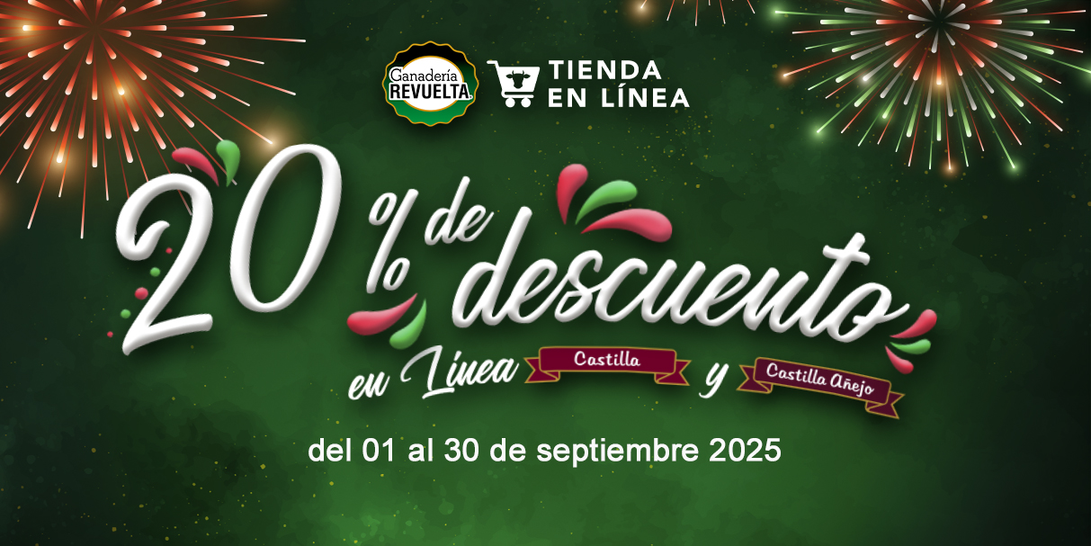 Vigencia 09 al 16 de Septiembre del 2024 , no aplica con otras promociones, válido solo en Tienda en Línea de Ganadería Revuelta. Productos Participantes para el descuento son: