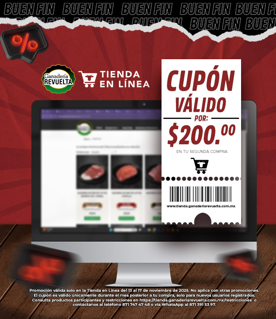 Válido solo en la Tienda en Línea de Ganadería Revuelta, Sujeto a cobertura de zona, no aplica con otras promociones, para más información puedes contactarnos al Tel. 871 747 47 48 o vía WhatsApp al 871 391 53 97