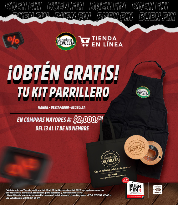 Promoción valida únicamente en Tienda en Línea de Ganadería Revuelta, no aplica con otras promociones, para más información puedes contactarnos al Tel. 871 747 47 48 o vía WhatsApp al 871 391 53 97.
